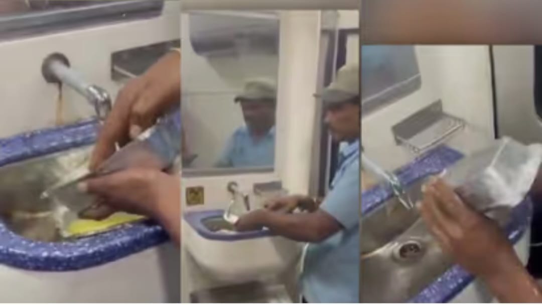 ട്രെയിനിൽ ഉപയോഗിച്ച ഫു‍ഡ് കണ്ടെയ്നറുകൾ കഴുകുന്നു, നടപടിയെടുത്തെന്ന് റെയിൽവേ.